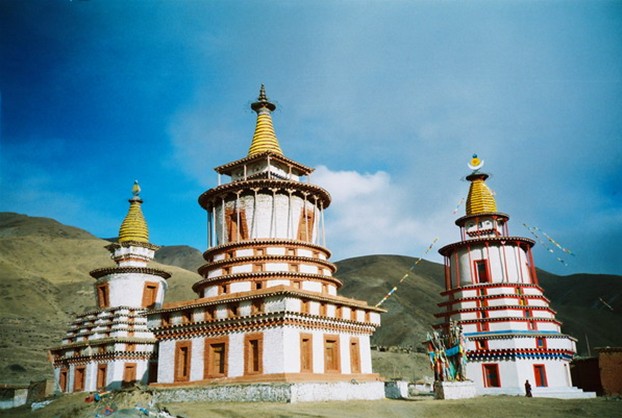觉囊寺坐落在日喀则拉孜县欧布琼山山腰处,海拔4600米。始建于公元十二世纪,由贡巴•土杰尊珠主持修建。该寺曾有二万多名僧人,在欧布琼山上有二千多处修行洞和坐禅房,并修建了一座“万佛一见得解塔”,塔高约27米,塔型呈“时轮坛城”,有108个门、108个殿堂。主供佛为喜绕坚赞师徒三尊佛。每年藏历4月15日,该寺举行“时转跳神”活动。