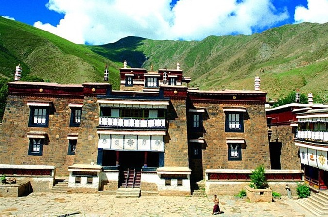 寺院坐西朝东,四面群山环抱,山清水秀,环境十分优美。面积约10万余平方米,围墙为多边形。寺内主要建筑为祖拉康佛殿,坐西向东,高三层。底层为大经堂,面阔5间,进深6间,内有20根方柱,其中有两根高5.5米的林柱通向二层。