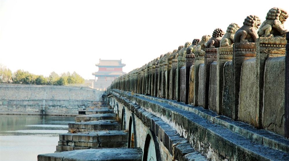 卢沟桥始建于1189年六月,明昌三年(1192年)三月完工。两侧石雕护栏各有140条望柱,柱头上均雕有石狮,形态各异,据记载原有627个,现存501个。石狮多为明清之物,也有少量的金元遗存。“卢沟晓月”从金章宗年间就被列为"燕京八景"之一。