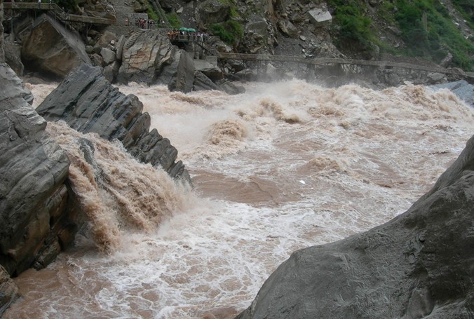 石鼓以下,江面渐窄,至左岸支流硕多岗河口桥头镇,往东北不远即进入举世罕见的虎跳峡。虎跳峡上峡口与下峡口相距仅16公里,落差竟达220米。平均坡降达13.8‰,是金沙江落差最集中的河段。峡中水面宽处60米,窄处仅30米并有巨石兀立江中,相传曾有猛虎在此跃江而过,故名虎跳石,虎跳峡也由此得名。峡内急流飞泻、惊涛轰鸣,最大流速达10米/秒。峡谷右岸为海拔5596米的玉龙雪山,左岸为海拔5396米的哈巴雪山,两山终年积雪不化。峡内江面不足海拔1800米,峰谷间高差达3000余米。峡中谷坡陡峭,悬崖壁立,呈幼年期“V”型峡谷地貌。
