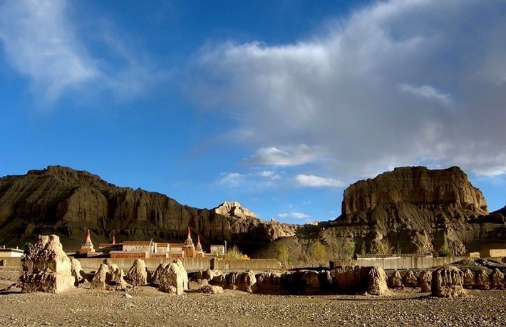 托林寺,意为“飞翔寺”。寺周地势平坦,原多僧舍,现为民居。寺庙南以土山为屏,北临朗钦藏布,殿堂、佛塔、塔墙、僧舍如星散布,远眺气势非凡。托林寺原有建筑规模较大,包括朗巴朗则拉康、拉康嘎波、杜康等三座大殿,版权所有山东聊城聊之旅国际旅行社有限公司,转载必究!巴尔祖拉康、玛尼拉康、吐几拉康、乃举拉康、强巴拉康、贡康、却巴康等近十座中小殿,以及堪布(寺院住持)私邸、僧舍、经堂、佛塔、塔墙等建筑。由于历史原因,寺院受到不同程度的破坏,保存较好的只有三大殿和一座佛塔。
