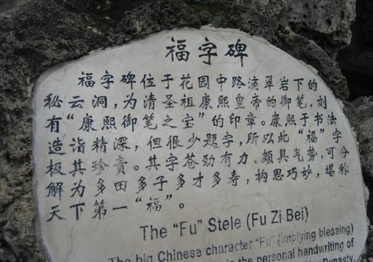 恭王府中”福”字碑藏在花园的假山内,这座假山是用糯米浆砌筑成的,非常坚固,山上置两口缸,缸底有管子通到假山上,通过往缸中灌水的办法来增加院中的湿度。假山下有一幽静的“洞天”,称秘云洞,洞的正中有一康熙皇帝为其祖母孝庄皇后祝寿写的“福”字碑,刻有“康熙御笔”之宝印。碑高1米左右,长80厘米左右,贯穿整座假山。福字碑寓意福照全园,因为康熙留存人世的题字极少,所以福字碑倍显珍贵。据说当年嘉庆查抄和珅府时,想把这个福字移到皇宫,但是由于和珅设计巧妙,动福就动龙脉,这是皇帝最忌讳的,大怒之下,下令将假山封死,从此,康熙墨宝福字在所有的史书中消失了。直到建国初,周总理在一次接见外宾之后在花园无意中发现假山上面石头的形状象龙头,按说龙头下必有国宝,于是马上打电话给郭老(郭沫若),打开被封的洞门,发现了福字碑,经过文物部门的考证,确认其为康熙当年写给孝庄太后的福字,而盖在福字中央刻着“康熙御笔之宝”的大印已成为当今世上所留的唯一一个完整的康熙大印印章。