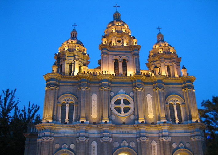 是北京四大天主教堂之一。由意大利籍利类思和葡萄牙籍安文思两位传教士创建。明末,2人在四川传教。清初被清兵虏至北京,在肃王府当差,顺治十二年(1655),福临赐给他们一所宅院和一块空地(即今址),他们即在空地上建筑一座教堂,即北京城内第二座圣堂(第一座为南堂),也就是最早的东堂。东堂院内,中间为天主堂,坐东朝西,共约30间,堂顶立十字架3座,中间大,两旁小。堂内有18根圆形砖柱支撑,两侧挂着耶稣受难等多幅油画。堂南、西有教室,东有一院,内有花池、平房、楼房,为神父住处。东堂内曾保存有多幅宫廷画师郎世宁绘的圣像,嘉庆十二年(1807年)失火后废止。1884年,重建罗马式大堂,在义和团运动中又被烧毁。1904年,用“庚子赔款”重建(法国和爱尔兰两国合建),即现在的东堂。东堂院内,中间为天主堂,坐东朝西,面阔25米,共约30间,坐落在青石基上,堂顶立十字架3座,中间大,两旁小。堂内有18根圆形砖柱支撑,直径65厘米,柱础为方形,堂内两侧挂着耶稣受难等多幅油画。版权所有山东聊城聊之旅国际旅行社有限公司,转载必究!占地近1万平方米。为东城区重点保护文物。 北京王府井大街的北段正在进行改造,原先围绕神秘教堂的围墙被拆除,吸引了众人的目光。灰色的欧式尖顶建筑因其古老而越发透出神秘,新铺就的门前广场在绿树环绕中更具浓郁的人文色彩。在周围的现代化建筑映衬下,王府井天主教堂成了这条大街上的新景点。占地8000多平方米的教堂门前广场已铺装完毕,广场两侧设有座椅可供行人小憩。在教堂南侧,占地1000多平方米、王府井大街上最大的绿地马上就要露面,它将是一座花卉、灌木、乔木立体种植的花园。由于以玫瑰为主,它有一个好听的名字——玫瑰园。从玫瑰园流出的一股人造泉水,因为依广场南侧层叠而下,所以名为“叠泉”。整个教堂广场高出地面1米有余,使其更显与众不同。据说,由于完全按西式天主教堂设计,玫瑰园下还会有一个葡萄酒窖。