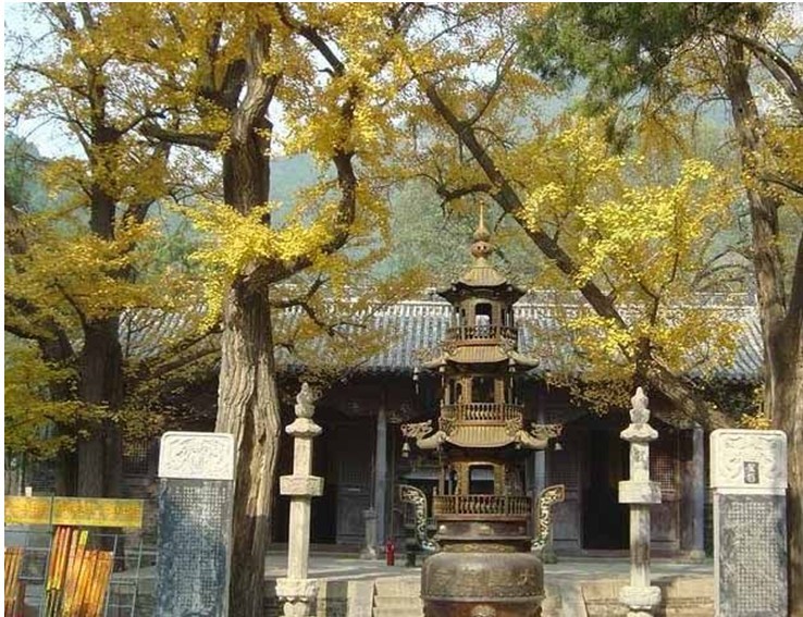 即五峰山,禅林寺古银杏风景园“三古”之一,这座屹立于燕山丛中的名山,东与名胜舍身台眺望,西和边关古隘罗文峪遥对,南临沙河,北靠长城。五座并峙的峰峦自北向南延伸十数里,禅林寺便建于中峰下端。著名的“五峰拱翠”一景,版权所有山东聊城聊之旅国际旅行社有限公司,转载必究!便来于此。“周围古松夹径,林木阴翳,云影烟光,红紫万状,映带寺之左右”,形成了东、西“四峰侧立,如拱如伛,俨然左右夹辅之象,真奇观哉。境内诸山应以兹为冠”,故于清代列为一大名胜(见《遵化州志》)。“五峰拱翠”之景,并非骚人墨客夸大渲染,事实上确实引人入胜。满山上下怪石嶙峋,结构复杂,形态各异。翠柏青松漫坡遍壑,形状更为奇特,有的横生于崖额,圆圆的树冠,似一顶华盖撑在半空,有的树干弯而直立向上,形如世外仙人腾跃空中,有的矗于乱壁、峰顶、怪石之上,迎霜傲雪,挺拔峭立,千百年来吸引着无数的游客。