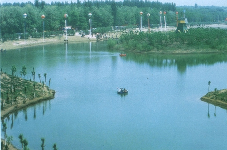 愉湖风光区,突出蓝天、碧水、绿地的主题,以大片水面和大面积的森林景观相映成趣。建有360亩的 沐浴库区,筑有假山、湖心岛,配有游船、皮滑艇、动力风车等游乐设施。栽植榆、五角枫、金丝柳等观赏植物28种17万株,栽植草皮5.1万平方米。疏林密地,青少年活动区,水上风光区,别墅区,休疗区等。与对餐交通干道临南路融为一体,以大面积的水面和树林塑造景观。