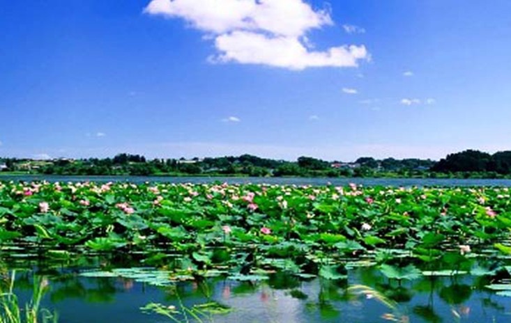微山湖是中国著名的六大淡水湖泊之一,风光秀丽,美丽而又神秘,自然而又洒脱,山、岛、森林、湖面、渔船、芦苇荡、荷花池,还有那醉人的落日夕阳、袅袅炊烟等,和谐统一地结合起来,构成了微山湖特有的美丽画面,是个天然的大公园。这些风物中,尤以有“花中仙子”之称的荷花最为耀眼,其美丽的身姿,和出淤泥而不染的性格,又全身都是宝,人们甚是喜爱。其洋洋洒洒地铺到湖面上,有的多达几拾万亩,蔚为壮观,所以又有人把这里叫作“中国荷都”。