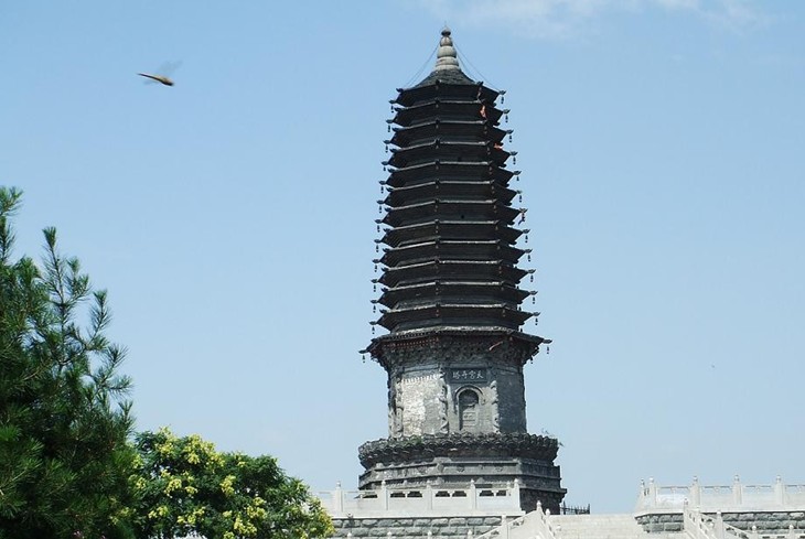 天宫寺塔是原天宫寺的主要建筑。天宫寺始建于辽清宁元年,始称"南塔院",辽寿昌三年称"极乐院",乾统五年改称"天宫寺"至今。天会五年八月敕加"大天宫寺"。天宫寺是一座三进院的寺庙,坐西朝东,分上寺和下寺。除天宫寺塔外,其它建筑主要毁于1928年、1954年和1958年。天宫寺塔为上寺的主要建筑,始建于辽清宁八年,平面为八角形,占地面积50.9平方米,面南背北,为十三层叠涩檐实心塔,高24.2米,塔基为须弥座,束腰部分每面砌有壶门两个,束腰上部为平座斗拱承托着几何、花草图案的栏杆、栏板,最上面是三层砖雕仰莲包围着一层塔身,一层塔身最高大,南、东、西、北四面设有假门,其余四面平素,八个转角处为砖雕盘龙倚柱,普柏枋之上为仿木五铺作砖雕斗拱,转角的斜拱与应县木塔转角斗拱相 似,上部各檐均用砖叠涩而成。塔刹也是砖叠涩而成。 宝顶为红铜渗金,重铸于清康熙十六年。在塔檐上部有两个塔腔,在1987年修缮中出土了大批珍贵文物,其中一级文物12件,二级文物26件,三级文物33件。