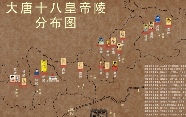 在主峰地宫山之北面,是内城的北门玄武门,设置有祭坛,紧依九嵕山北麓,南高北低,以五层台阶地组成,愈往北伸张愈宽,平而略呈梯形,在南三台地上有寝殿,东西庑房,阙楼及门庭,中间龙尾道通寝殿,是昭陵特有的建筑群。在司马门内列置了十四国君长的石刻像:突厥的颉利、 突利二可汗,阿史那社尔、李思摩、吐蕃松赞干布,高昌、焉耆、于阗诸王,薛延陀、吐谷浑的首领,新罗王金德真,林邑王范头黎,婆罗门帝那优帝阿那顺等。这些石像刻立于高宗初年,反映了贞观时期国内各民族大团结、唐对西域的开拓以及与邻邦关系的盛况。这些石像在早年已遭破坏,今可见者有七个题名像座,几躯残体和几件残头像块。前人曾说这些石像,“高逾常形,皆深眼大鼻,弓刀杂佩,壮哉,异观矣!”从发现的残体来看,石像高不过六尺,连座约9尺许,并未超过常形,头像残块可以看出确有深眼高鼻者,有满头卷发者,有辫发缠于头者,版权所有山东聊城聊之旅国际旅行社有限公司,转载必究!有头发中间分缝向后梳拢者,有戴兜鍪者,但未见有弓刀杂佩者。服装有翻领和偏襟两种,其余则不能确知。仅从这些情况可以看出这些石刻像也应属于写实之作。