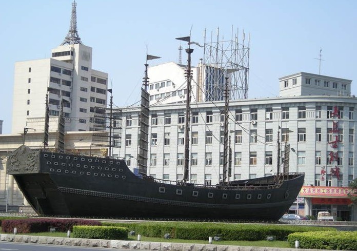 港湾广场位于大连市中山区人民路西端的尽头,是大连港客运码头前的交通广场。港湾广场占地面积1.5万平方米,其中中心绿地面积5300平方米。广场中间是铜制的郑和下西洋的帆船模型,展现了中国古代的航海文明。广场西北角是大连服装交易市场和大连古玩交易市场。港湾广场建设至今经过了多次改造。最初港湾广场是由若干个分散的花坛构成的广场,后来改造成以中心椭圆形绿色模纹花坛为中心的植物景观广场,最后改造成如今的集雕塑、水景、植物景观为一体的景观广场。