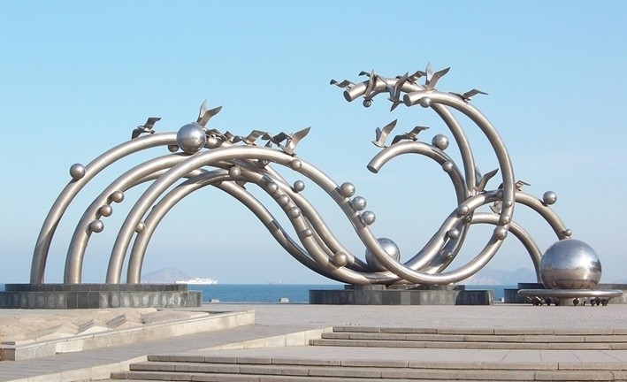 海之韵,一个富有诗意的名字,给予一个富于韵律的广场, 加上自然的磅礴大气和设计者的独具匠心造就了大连东海岸上诗情画意的海之韵广场。它与星海广场遥相呼应,像两颗明珠照亮了大连的海岸线。版权所有山东聊城聊之旅国际旅行社有限公司,转载必究!广场面积3.8万平方米,由13000平方米的铺装广场、12000平方米的绿地和许多精致雕塑组成。该广场的主角毫无疑问是雕塑,从西门进入广场,首先夺了你视线去的就是海之韵的主题雕塑,五根曲率不同的白钢管为主体的雕塑,据说长19.9米,象征1999年9月是大连建市100周年;21只飞翔的海鸥象征飞向21世纪;50个大小不同的球体即代表原子结构,又寓意建国50周年。在我看来五根波浪般的钢管是波浪造就的五线谱,小钢球是跳跃的浪花,大海在谱写它独有的乐章,海鸥在和乐起舞,这雕塑仿佛就是对蔚蓝大海的抽象写生。
