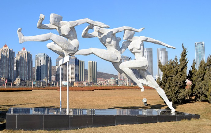 总占地面积176万平方米,广场中心由999块四川红色大理石铺设而成,红色理石的外围是黄色大五角星,红黄两色象征着炎黄子孙。广场周边还设有5盏高12.34米的大型宫灯,由汉白玉柱托起,光华灿烂,与华表交相辉映。广场四周,雕刻了造型各异的9只大鼎,每只鼎上以魏碑体书有一个大字,共同组成"中华民族大团结万岁",象征着中华民族的团结与昌盛。从中心广场南行,便是"百年城雕"。百年城雕的尽头是打开的书形广场,面对无垠的大海,寓意着百年后的大连又翻开了新的一页。从中心广场北行,则是会展中心,它是集展览、会议、贸易、金融、娱乐为一体的具有国际一流水平的现代化建筑。贯穿广场南北的中央长廊,建有喷泉水景大道。整个广场绿草茵茵,版权所有山东聊城聊之旅国际旅行社有限公司,转载必究!每隔20米的航标石柱灯一线排开直通大海,典雅肃穆,宁静致远。中心广场面积4.5万平方米,这是一个纪念香港回归的工程。 广场中心全国最大的汉白玉华表,高19.97米,直径1.997米。华表底座附有八条龙,柱身雕着一条龙,九条龙寓意中国九州。华表顶端坐着金光闪闪的望天吼,高2.3米。围绕华表的的汉白玉石柱高12.34米,各自托起的是一盏宫灯。广场中心仿效北京天坛圜丘的设计,由999块四川红大理石铺成,大理石上刻着天干地支、24节气和12生肖,站在自己的生肖上摄影 ,可以带来好运。广场内园直径199.9米,外圆直径239.9米,寓意2399年大连将迎来建市500周年。在1999年添加了书页建筑和脚印等雕塑。