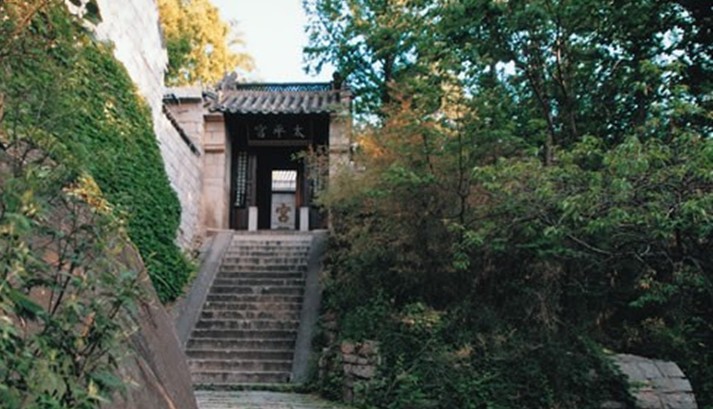 太平宫初名太平兴国院,又称上苑。系宋太祖为华盖真人刘若拙敕建道场,金明昌年间(公元1190~1195年)重修。正殿名三清殿,配殿为三官殿和真武殿,坐落在崂山东部上苑山北麓、仰口湾畔。 宫西绝壁矗立,下有天然石洞。洞内纵横各数丈,高敞如厦;洞顶镌刻“混元石”三字及星斗图案;洞旁眠龙石上,镌“犹龙洞”三字。宫北山坡下有涧水喷涌,相传曾有农人见白龙游泳其中,名白龙涧。涧底巨石累累,横跨两岸,水从石隙下泻,称仙人桥。过桥山坡有巨石,上刻邱处机咏崂山七绝20首及序。 宫东北奇峰突起,形同巨狮,张嘴作怒吼状,名狮子峰。峰巅岗峦平敞,云气弥漫,有“狮岭横云”胜景。