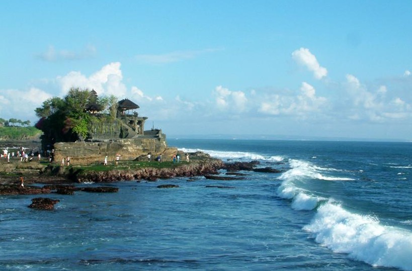 海神庙(Tanah Lot)是巴厘岛最重要的海边庙宇之一,始建于16世纪。该庙坐落在海边一块巨大的岩石上,每逢潮涨之时,岩石被海水包围,整座寺庙与陆地隔绝,孤零零地矗立在海水中;只在落潮时才与陆地相连。