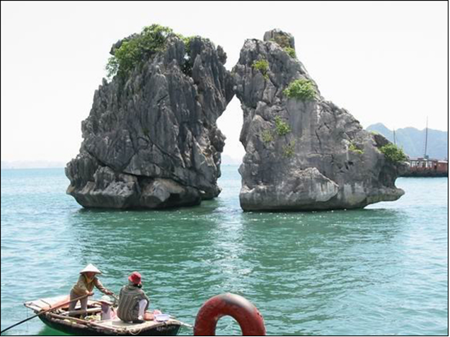 素有“海上桂林”之称。这是游人乘小渔船在越南下龙湾著名的“斗鸡石”前观赏风景