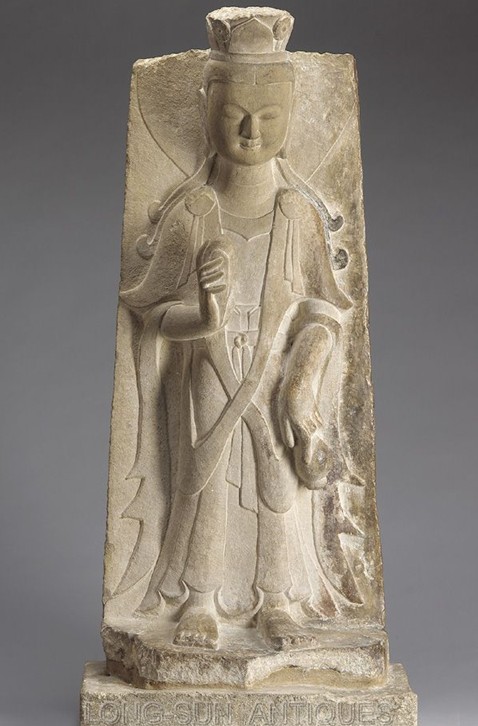 石像高3.9米,腰围2米,手长40厘米,背北面南,立于50厘米高的石雕莲花座上。石像刻线明显,披巾搭胸,细腰束带。雕线棱角分明,刀法洗炼,在个体石像中甚为罕见,为我国古代石雕珍品。现为省级重点文物保护单位。