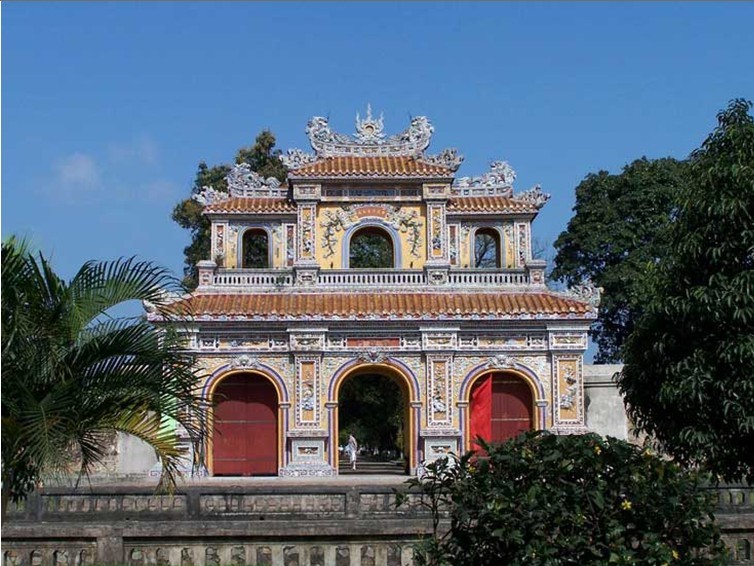 越南顺化故宫正门。规模比中国北京故宫的午门小,但其式样基本一样。平面呈冂形,下有高大的砖石墩台,台正面围以垛墙。墩台有5门,正中门高5.32米,宽3.28米,门正中上方有“午门”两个大字。当初字外包金,1943年12月10日包金被窃。墩台上建楼5座,名五凤楼,楼分两层,气势巍峨。下层正中是“御座”。上层为各宫人观礼之所。当时,午门只在庆典节日开放。午门也是阮氏王朝被埋葬的见证,1945年8月30日阮朝末代皇帝被迫在此正式宣布逊位,并把金印和宝剑交给越南临时政府代表团。午门建于阮朝明命十四年(公元1833年),启定三年(1921年)重修。抗战期间遭炮火破坏,现已修复。以前,阮朝嘉隆初年曾在午门现址建有南阙台。