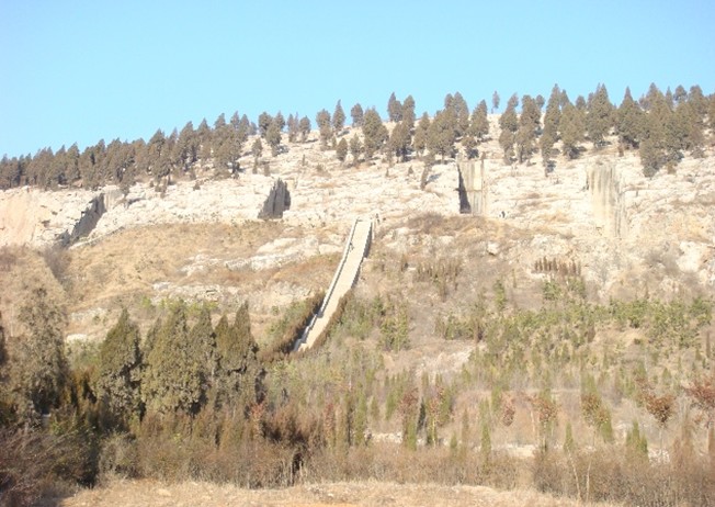陵墓均为依山凿洞,除东起第一座外,其余四座都于1970年被发掘。陵墓形制、结构基本相同,其中西起第三座最有代表性,墓纵深全长72.1米,最宽处24.3米,最高处18.4米,前为墓道,长37.5米,宽4.6—4.8米,最高处18.4米,由人工自山表下凿山石而成,葬后以土回填。墓道北端向北凿石为洞,依次为墓门、甬道、前室、前室四耳室、后室、石龛。墓门宽2.2米,高2.5米,深4.5米,以十九块长方形石块堵塞。甬道长17米,北端东西有耳室,左右各二室。前室东西8米,南北6.3米,高4.2米,后室置棺椁,长宽各6.5米,高4.6米,北壁凿刻石龛。版权所有山东聊城聊之旅国际旅行社有限公司,转载必究!为排掉山体渗水,墓底凿有水道自后室排向东车马室的自然山缝。整墓凿石2900多立方米。
