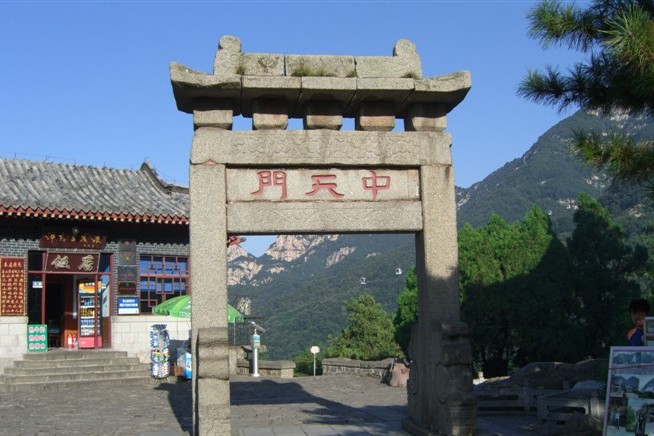 中天门建于清,为两柱单门式石坊。泰山古时多虎,古人在坊北建庙祀黑虎神,现庙内塑财神赵公元帅执鞭跨虎,东为仿古茶楼,西南为中溪宾馆,西北为中天门索道站。
