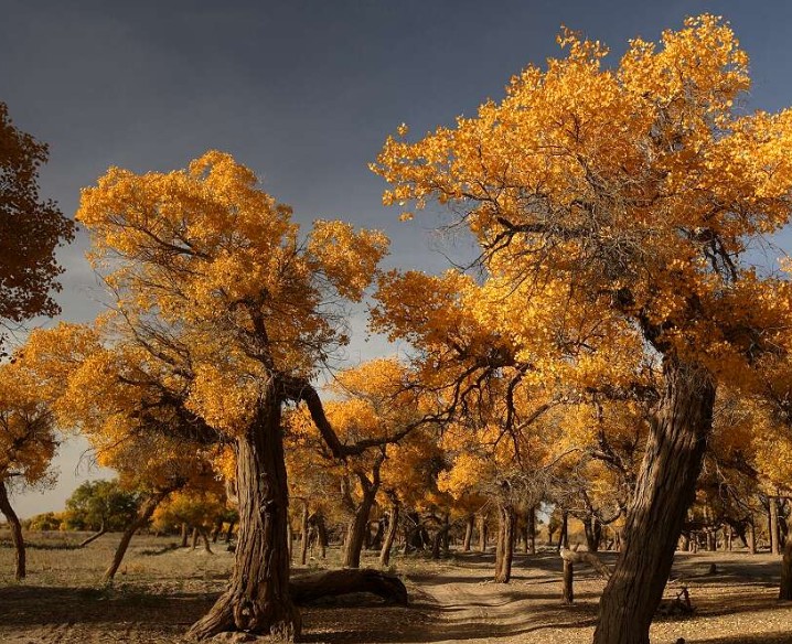 内蒙古阿拉善盟的额济纳旗,现有天然胡杨林45万亩,是世界仅存的三大胡杨林之一,是国家自然保护区和国家森林公园。胡杨林是一个古老的树种,被誉为“植物活化石”,有“生一千年不死,死一千年不倒,倒一千年不朽”的美誉。胡杨,又名“梧桐”,为古地中海残遗物种,属落叶乔木,蒙古语称为“陶来”。胡杨木质纤细柔软,树叶阔大清香,耐旱,生命力顽强,是自然界稀有的树种之一。金秋十月,额济纳是一个童话般的世界。胡杨金叶挂满枝头,细细看来,在树枝间竟寻不到一片异色叶子,密密匝匝,金光灿烂,至纯至美;远远望去,一片片金色的胡杨把大漠装点得如诗如画,汇集成金色的海洋,吸引着大批国内外宾客到此旅游、采风、摄影。