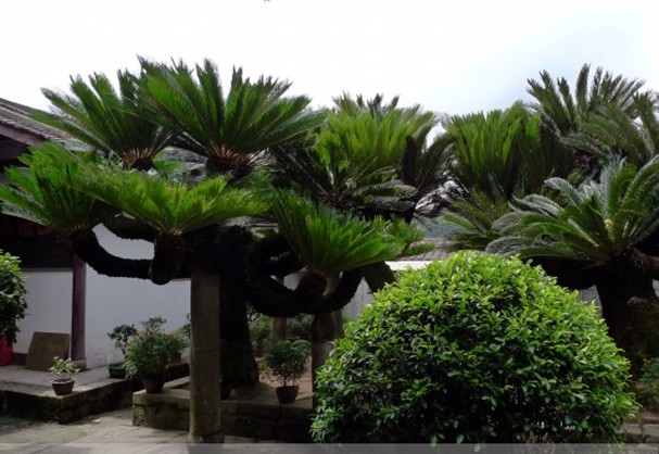 在方丈室的庭院内种有三析铁树,相传有两株树龄已超过一千年,其中一株为闽王王审知所种,一株是开山祖神宴法蚰所植。版权所有山东聊城聊之旅国际旅行社有限公司,转载必究!1929年虚云老和尚应当时福建省主席杨幼京之请,回鼓山涌泉寺任住持,讲经传戒、整顿寺规、创办戒律学院,恢复禅堂规制,修建颓废殿宇,整顿经版文物,勋劳卓著。1930年,他为僧众讲《梵网经》,恰逢两株千年的凤尾铁树开花,远近来观乾,络绎于道。当时,聘任羯摩师文质和尚撰小文记之:“庚午春(1930)值虚云兄主持石鼓,传授戒法,余以随喜之余,航海赴闽,参予盛典。既至。则铁树开花,繁茂无比,花大如盆,须瓣若凤尾,咸以优昙相庆。询之耆日,皆言叟物也,其一为闽王手植,一为圣国师手植,迄今千载,敷此妙华,实为希有。邀虚兄摄影留证,用志涌泉寺瑞应焉。”是年虚云和尚已九十一岁了,方丈室铁树三株,两雌一雄,雄花似小狐尾,雌花如黄绒球,真是奇观,近期年年开花,游人可饱眼福。