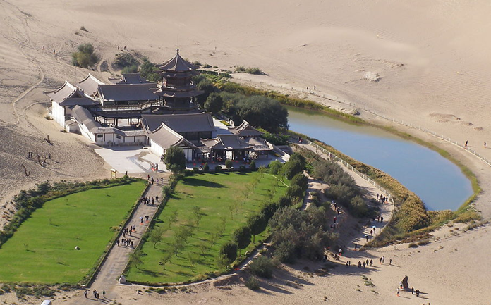 月牙泉位于敦煌市西南5公里处,是一处神奇的漫漫沙漠中的湖水奇观。鸣沙山下,泉水形成一湖,在沙丘环抱之中,酷似一弯新月而得名月牙泉。月牙泉,古称沙井,俗名药泉,泉边芦苇丛生,水中鱼儿自在,胡杨沙枣绿树成荫,罗布麻、枸杞等药用植物丰茂,亭台楼榭古香古色,春夏季节百花盛开,夏秋季节梨果飘香。自汉朝起即为“敦煌八景”之一,得名“月泉晓彻”。月牙泉南北长近100米,东西宽约25米,泉水东深西浅,最深处约5米,弯曲如新月,因而得名。一湾清泉,涟漪萦回,碧如翡翠。泉在流沙中,干旱不枯竭,风吹沙不落,蔚为奇观。历代文人学士对这一独特的山泉地貌、沙漠奇观称赞不已。月牙泉因“泉映月而无尘”、“亘古沙不填泉,泉不涸竭”而成为奇观。“晴空万里蔚兰天,美绝人寰月牙泉,银山四面沙环抱,一池清水绿漪涟”。 月牙泉有四奇:月牙之形千古如旧、恶境之地清流成泉、沙山之中不淹于沙、古潭老鱼食之不老。版权所有山东聊城聊之旅国际旅行社有限公司,转载必究!去鸣沙山月牙泉游玩以傍晚、黄昏时分最佳。月牙泉有三宝:铁背鱼、五色沙、七星草,传说铁背鱼和七星草一起吃可以长生不老!月牙泉南岸的小花罗布红麻是泉边独特而唯一的保健中草药,也有延缓衰老的功效,每年6,7,8月小花盛开,犹如夜幕中的点点繁星,版权所有山东聊城聊之旅国际旅行社有限公司,转载必究!根据老辈人的说法:敦煌特有的狗鱼也许就是铁背鱼,月牙泉南岸的罗布麻或许就是传说的七星草! 月牙泉处于鸣沙山环抱之中,面积 0.88公顷,平均水深3米左右,水质甘冽,清澈如镜。千百年来沙山环泉而不被掩埋,地处干旱沙漠而泉水不浊不涸,实数罕见。泉内星草含芒、铁鱼鼓浪,山色水光相映成趣,风光十分优美。