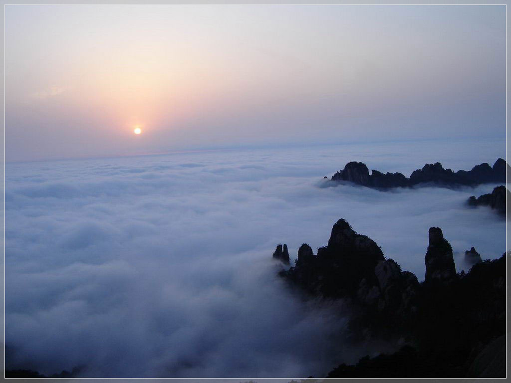 大凡高山,可以见到云海,但是黄山的云海更有其特色,奇峰怪石和古松隐现云海之中,就更增加了美感。黄山一年之中有云雾的天气达200多天,水气升腾或雨后雾气未消,就会形成云海,波澜壮阔,一望无边,黄山大小山峰、千沟万壑都淹没在云涛雪浪里,天都峰、光明顶也就成了浩瀚云海中的孤岛。阳光照耀,云更白,松更翠,石更奇。流云散落在诸峰之间,云来雾去,变化莫测。风平浪静时,云海一铺万顷,波平如镜,映出山影如画,远处天高海阔,峰头似扁舟轻摇,近处仿佛触手可及,不禁想掬起一捧云来感受它的温柔质感。忽而,风起云涌,波涛滚滚,奔涌如潮,浩浩荡荡,更有飞流直泻,白浪排空,惊涛拍岸,似千军万马席卷群峰。待到微风轻拂,四方云慢,涓涓细流,从群峰之间穿隙而过;云海渐散,清淡处,一线阳光洒金绘彩,浓重处,升腾跌宕稍纵即逝。云海日出,日落云海,万道霞光,绚丽缤纷。