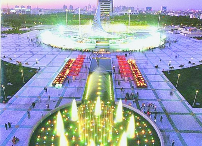 音乐喷泉是围绕主体雕塑而设置的,分别有中心音乐喷泉,环形音乐喷泉,旱喷泉、激光水幕四部分,其中,中心音乐喷泉的4个25米高的主喷泉喷涌时,在效果灯、五彩灯和地埋灯的映照下,五彩缤纷,令人惊叹,广场西侧的金字型建筑,就是激光水幕控制室,反映在水幕上的各种景物,都来自这个控制室的操作。