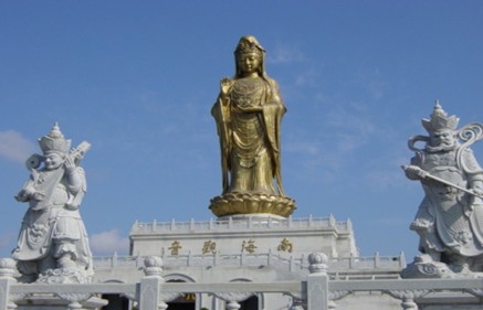 南海观音露天铜像位于普陀山之东南的龙湾岗巅。菩萨脸如满月,眉目清秀,左手托法轮,右手结无畏印,显现大慈大悲相,光耀天日,壮丽无比。像高33米,重70余吨,乃当今观音铜像之最,也是海天佛国的象征。版权所有聊城聊之旅旅行社有限公司,转载必究!佛像基层是面积1000多平方的功德厅,上层供奉500尊形态各异的观音铜像,下层大厅饰有观音灵异故事的大型黄杨木雕和以普陀山景色为题材的彩玉浮雕,精美绝仑。