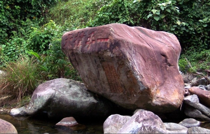 位于海南琼中县上安乡仕阶村,在五指山与汤匙岭之间的东边大岩石上,距五指山仅5公里,距上安乡13公里,离县城营根39公里。一片清代光绪十三年春砌志,是清朝将领冯子才及幕僚刻石,其中,“手辟南荒”、“一手撑天”、“百越锁钥”、“巨手擎天”等摩崖石刻群。字大如斗,笔法浑厚,气势磅礴。明代大学士邱浚的咏五指山诗曰“五峰如指翠相连,撑起炎荒半壁天。夜盥银河摘星斗,朝探碧落弄云烟。雨余玉笋空中现,月出明珠掌上悬。岂是巨灵伸一臂,遥从海外数中原”。