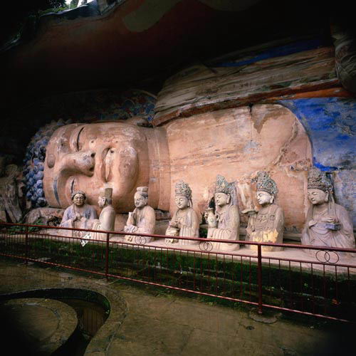这是擂鼓台中洞,又名大万伍佛洞。是一座武周禅宗窟,中国佛教的禅宗是以专修禅定为主的教派。“禅定”就是安定而止息杀虑的意思。洞顶作穹隆形,并有装饰华丽的莲花藻井,造像是一佛二菩萨,主佛为双膝下垂而坐的弥勒佛,壁基有二十五尊高浮雕罗汉群像,从南壁西起到北壁西止。罗汉群像构成一个半环形装饰带,罗汉群像均罗汉身旁都刻有一段从《付法藏因缘传》里摘录的经文介绍该罗汉的身世及特点。所刊经文中多杂以武周新字,这是是武周时期禅宗所经营的洞窟。