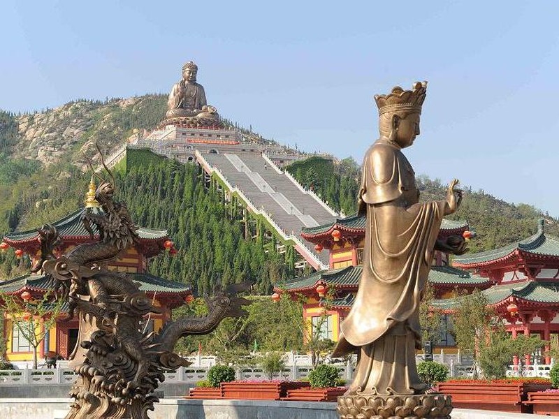 释迦牟尼坐佛造像,选材锡青铜铸造,大佛高38.66米,重380吨。由232件佛体、108块莲花瓣、302个发髻、共642块,锡青铜铸件组合而成,堪称目前世界第一大铜铸佛。大佛右手作“施无畏印”,左手作“施与愿印”, 版权所有聊城聊之旅旅行社有限公司,转载必究!表示佛为众生拔除苦难,给予幸福。莲花座下建有功德堂、万佛殿和佛教历史博物馆。万佛殿内陈列着9999尊造型逼真,栩栩如生的金铜佛像,与大坐佛共同构成了万尊佛像的宏大阵容,佛教历史博物馆内展示了佛教文化兴起兴盛的历史记载,馆内陈列展出了释迦牟尼佛舍利等数十件文物和佛教文化艺术珍品。南山大佛熔古今中外佛像铸造艺术的精华,使古老的青铜铸造艺术和现代科技成果于一体,展现了佛教文化和现代文明的完美结合。