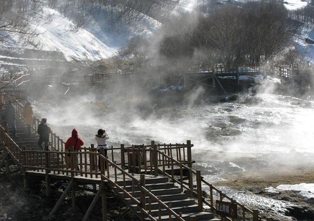 在长白山黑风口滚滚黑石下面有几十处地热,大如碗口、小有指粗,这就是分布在1000平方米地面上的长白山温泉群。在冬天,周围一片银装素裹、冰天雪地,而这里却是热气腾腾、烟雾袅袅,实在是别有一番景致。长白山温泉属于高热温泉,多数泉水温度在60℃以上,最热泉眼可达82℃,虽然供游客洗浴的温泉都经过了冷却处理,却依然足够热烈,这一点,东北温泉,从不含糊。