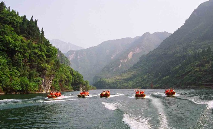 2003三峡大坝蓄水后,九畹溪漂流分两段,上段6.8公里惊险刺激的探险漂,下段6.4公里的休闲观光漂,高峡平湖相间,奇峰秀水争艳,畅游其间,惬意无限。宏伟的三峡大坝、雄浑的崆岭险滩、威武的将军岩,将一解峡江山水的雄奇与秀美;壁立的问天简、沧桑的巨鱼坊、神秘的古悬棺,一展巴楚文化的神韵。