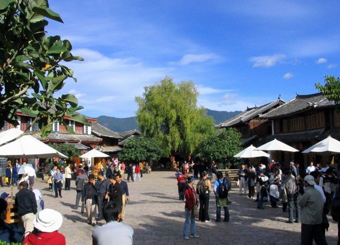 四方街是丽江古城心脏,交通四通八达,周围小巷通幽,据说是明代木氏土司按其印玺形状而建。这里是茶马古道上最重要的枢纽站。明清以来各方商贾云集,各民族文化在这里交汇生息,是丽江经济文化交流的中心。这里是历代集市中心,每日万头躜动,热闹非常。从四方街四角延伸出四大主街,直通东南西北四郊,又从主街岔出众多街巷,如蛛网交错,往来畅通。街道全用五彩石铺砌,平坦洁净,晴不扬尘,雨不积水。几乎每条街道一侧都伴有潺潺流水。由此形成以四方街为中心,四周店铺客栈环绕,沿街逐层外延的稠密而又开放的格局,古老的集市就这样孕育了城市最初的形状,这与中国传统的四四方方的井字形街道是不是一样的。