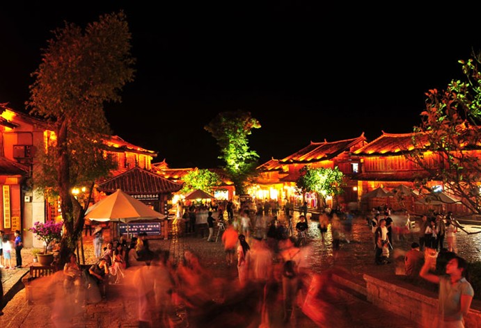 古城四方街最迷人的是晚上,沿河都是些大大小小的酒吧,茶楼。其中不乏外国人经营者。这些酒吧,茶楼门前,大红灯笼型状各异,高高的悬挂在每户人家门前。晚间的四方街就这样笼罩在温暖祥和的气氛中。红灯笼的倒影随河水飘荡,约约绰绰。这里是历代集市中心,每日万头躜动,热闹非常。从四方街四角延伸出四大主街,直通东南西北四郊,又从主街岔出众多街巷,如蛛网交错,往来畅通。街道全用五彩石铺砌,平坦洁净,晴不扬尘,雨不积水。几乎每条街道一侧都伴有潺潺流水。由此形成以四方街为中心,四周店铺客栈环绕,沿街逐层外延的稠密而又开放的格局,古老的集市就这样孕育了城市最初的形状,这与中国传统的四四方方的井字形街道是不是一样的。