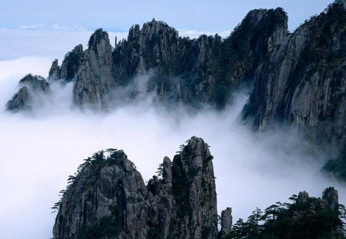 云海:晴空万里时,白云从千山万壑中冉冉升起,苍茫的云海犹如雪白的绒毯,缓缓地铺展在地平线上,光洁厚润,无涯无边。山风乍起时,云海四处飘移,群峰众岭变成云海中的座座小岛;云海聚拢过来时,千山万壑隐藏得无影无踪。云海时开时合,恰似“山舞青蛇”,气象十分雄伟。