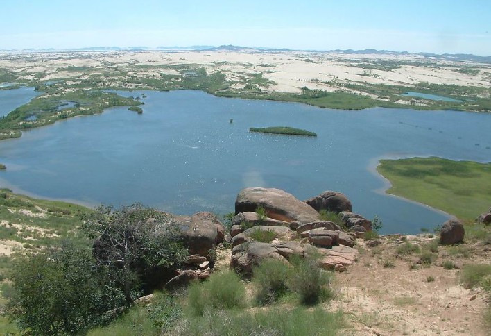 玉龙沙湖位于内蒙古赤峰市翁牛特旗乌丹镇境内,国家AAA级景区,距赤峰市90公里。旗政府所在地乌丹镇区与该景区有三级油路相通。玉龙沙湖度假区集沙漠、沙地、古松、怪石、奇峰、湿地、草原、湖泊为于一身,5万亩草原与茫茫无边的科尔沁沙地相连,沙地中有一眼清泉,泉水喷涌近1米高,每小时喷水数百吨,在沙漠中积水成湖。
