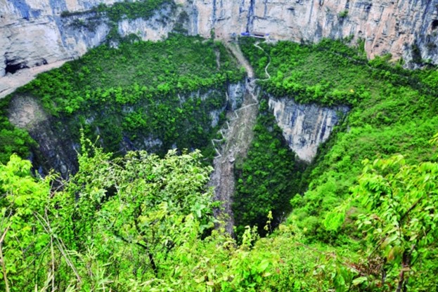 从坑口到坑底有一条蜿蜒曲折的梯道,总长度2.7公里(2800余步台阶)地缝是两座平行山峦间凹下去呈“V”字形的一条大裂缝, 它发源于奉节县长安乡火烧二坝,全长37公里。地缝上段地势开阔,林木繁茂,小桥流水;版权所有山东聊城聊之旅国际旅行社有限公司,转载必究!中段逼仄如巷,宽处达70米左右,最窄处仅容一人通行,最深处达900米,溪水自“黑眼”一带注入地下暗河,形成干谷;下段是地下峡谷,中外探险家曾多次深入地缝中探险,专家推测地缝暗河流向了小寨天坑。
