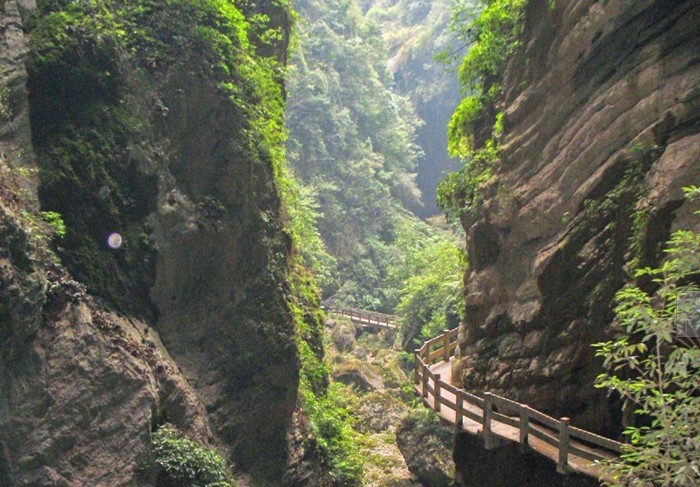 上部宽10至30米,谷底宽仅1至30米,悬崖最深处达300米,是一条世界罕见的“一线天”景观。同时, 崇山峻岭中清澈碧透的涓涓溪流, 原始草场和繁茂的森林, 又组成了一个世外桃源的人间仙境。 由于这里海拔在1000米以上, 又成为了避暑观赏雪景的最好场所。而且这里的山乡风情, 更象一首浓郁的土家族情歌,其纯朴的民俗民风让无数中外游人留连忘返.