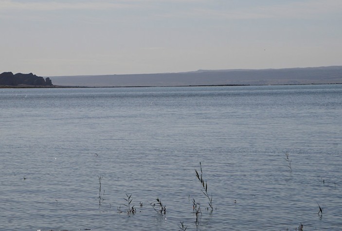 托素湖除了河道入湖出有稀疏的芦苇外,和湖内少量的浮游生物外,几乎没有水草,湖周围零星生长着白刺,怪柳,莎莎等植物。