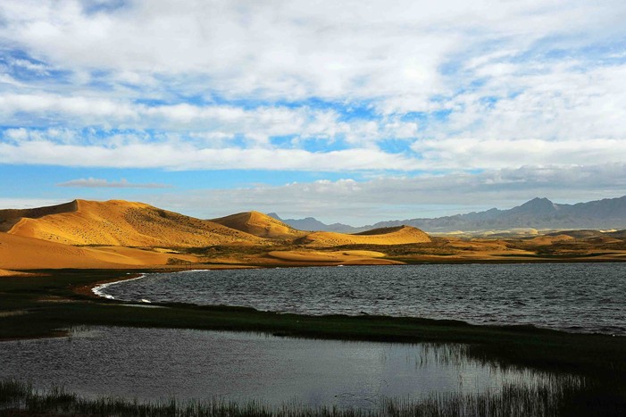 这就是金子海,蒙古语意为阿东木拉古湖,面积约0.45平方公里。相传成吉思汗领兵经过此地时,丢下的金盏化为金子海;版权所有山东聊城聊之旅国际旅行社有限公司,转载必究!也有传说牦牛山上下来一对金羊,在湖边饮水,尝到水味香醇甘甜,就不愿再回山而进入湖中,故称该湖为金子海。海的西侧、西北侧、东侧都被沙山环抱,沙质是那般细腻,情不自禁让人赤足,与其有更为亲密的接触。唯独海的东南侧是高高的芦苇和近百米的草带,吸引着鸟禽、牛羊觅食、嬉戏、休憩。水至清则无鱼。由于金子海是由一眼甘甜的泉水日积月累而成,因此水极为清澈,浅水处不曾发现鱼儿,版权所有山东聊城聊之旅国际旅行社有限公司,转载必究!有的只是小海螺和小贝壳。其实,海的深处是有鱼的。考古发现金子海的东边是青铜器时代的文化堆积层,有石器和诺木洪文化夹砂褐陶罐残片;说明,海的形成历史悠久。在茫茫戈壁,有这样一池甘甜的泉水养育着周围的牧民,滋润着这片土地上的一切生物,生生不息。