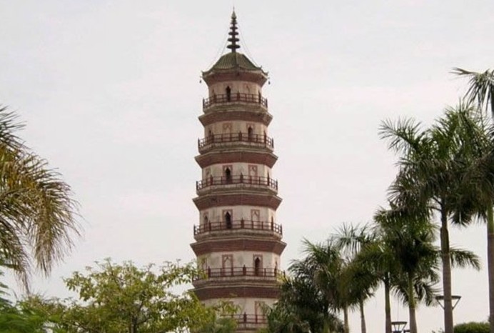 金鳌洲塔位于东莞市莞城西南1公里处,即万江桥畔。因其座落于万江金鳌洲,故名。金鳌洲古塔始建于明朝万历二十五年(1597年),合尖于天启四年(1624年),历时27年。据悉,建塔之目的为“以培风气,亦堪兴家所宜也”。原为抗御水害的镇水宝塔,8角10层,盖顶有塔刹,无塔檐,无栏杆,砖牙叠砌。后于清乾隆二年(1737年)重建,塔基距水边仅三、五米之遥,此塔处于江心陆洲,三面环水,经二百五十多年,保存完整,基础稳固,巍然耸立于东江之滨。