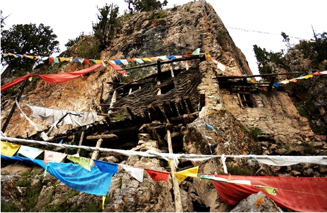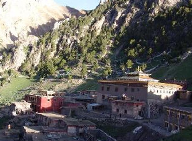 海拔4300m的达那寺坐西北面朝东南,1400多年悠久历史的寺院就象坐落在一把“太师椅子”上一样,中间一块较平坦的草坡上坐落着古老的寺院;左右“扶手”上也有大小各异的僧舍,右边“扶手”略高于左边“扶手”。