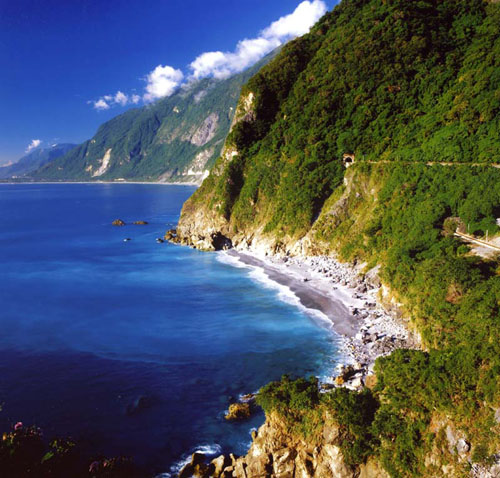 车过崇德大隧道,可见苏花公路凿壁而筑。一道凹槽仿佛镶刻在高距海面数百米的崖腰上,随突向海面的参差岩壁而曲折回转,盘旋若龙。远看公路,好像缠绕在危崖腰部的腰带,又似摩天大厦高层的一道没有栏杆的悬空阳台走廊,汽车在上面飞驰,稍有不慎,便要滚入几百米下的太平洋中。坐车的人掠崖凌空,临海观潮,大有惊心动魄之感。车过清水崖,穿过若干隧道,便到和平站,再向版权所有聊城聊之旅旅行社有限公司,转载必究!北,便是苏花公路北段,直抵苏澳渔港。