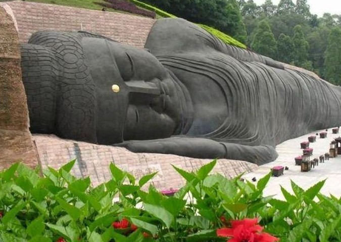 大卧佛位于森林公园天仙岩。相传当年佛教大师六祖惠能传教后深夜经过这里,看到天仙岩灵光闪烁,隐约可见这块横卧的大石块就是一个大卧佛,六祖立即跪拜,求佛祖降福天下。大卧佛的雕造从这个传说获取灵感,以盛唐敦煌卧佛为范本,佛身长108米,尺度堪称世界之最。现经改造用紫铜包装大卧佛,成为金装大卧佛。大佛前面是锦鲤池和荷花池,与大佛相互映衬引人入胜。大佛对岸一层为长六十米的长廊,廊内彩绘佛传故事,二层为敬佛台,凭栏对拜,大佛全景一览无遗。