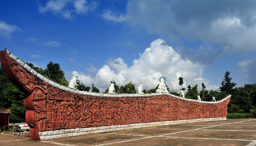 迎宾主景主要有葫芦女神,避山虎,照壁主浮雕《彝山欢歌》。