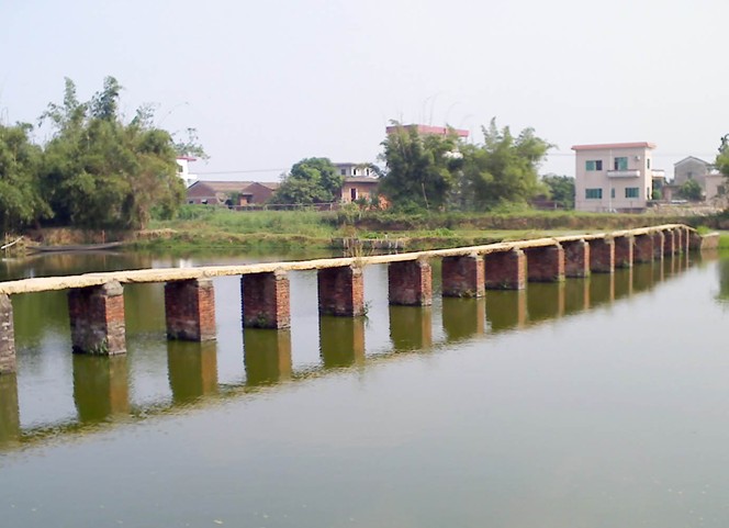 沿着弯弯的乡间小路,可来到古劳水乡一处名叫“二渡桥”的地方。只见前面的围墩上,有几棵百年老榕,静静地镇守和护卫着这一方水土。榕荫下,几块长条花岗岩石条曲曲折折地架在鱼塘边的木桩上,颇有一种“小桥流水人家”的韵味。这种花岗岩石条,当地人称它“条石”或“西樵石”。因水乡的泥土细滑,不易渗水,偶尔几滴小雨,这里便遍地泥泞,行走不便。于是居民们便用这种“条石”沿着小河涌和糖基铺路,形成了遍布水乡的石板小桥和石板小路,构成一幅独特的风景。
