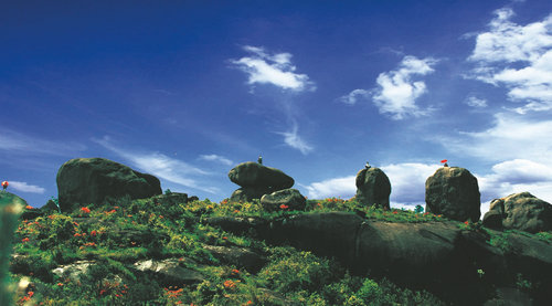 石海:是苍南玉苍山自然景观的精华。这里无处不石,无石不美,各具神态,妙趣天成。仙人址眇、石瀑岩、石海覆舟、望天龟、摇动岩、锦绣谷……,大自然的鬼斧神工造就这个奇石世界,使一些对玉苍胜景情独钟者发出了"桂林山水甲天下,玉苍石海甲神州"的赞叹!