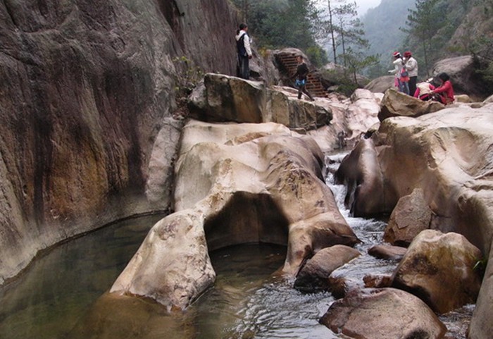 奇石群:数十块10—50吨的巨石,经过百万年水的冲刷,表面纹理不一,有似鱼鳞、浮雕、地图等,其中有一块酷似毛泽东的狂草手书。