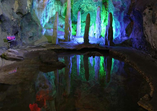 蟠龙洞的特殊景观有三外:其一是世界三大石花洞之一。洞内石花剔透玲珑,晶莹如玉,它附着于岩壁之上,不按重力方向生长,版权所有山东聊城聊之旅国际旅行社有限公司,转载必究!而向四面节节开花,见气成石,继续生长,变幻无穷。其二是我国南方典型的大熊猫--剑齿象动物群"古动物化石区",最为珍贵的是"智人"古人类化石。其三是蟠龙洞尚未开发的龙泉地下河,河中有泉眼,每隔十分钟左右,泉眼波浪翻滚,似海潮汹涌,冲刷河岸,随后又似退潮,静静地回流石洞,经专家确认为地下间歇泉,是一罕见洞府奇观。洞长千米,深暗幽邃。里面有高达30米的螺顶,有深不见底的石罅,宽阔空旷处都能容千人,窄处不能2人并行。在洞内跺脚砸壁会发出“嗡嗡”回音,给人一种神秘莫测的感觉。洞口朝南,为券拱门,门上坎刻“龙洞熏风”四个篆字,为康熙14年5月立。洞内10米处,有一供台,台上神像已废,只剩台下残存的几尊罗汉石像身躯。向洞内行至30米处,开始向右下方拐弯,回头外望,只见洞口犹如月牙出山,人称“回首望月”。继续前行,步步厅景。钟乳石形成的“火烧葡萄架”含珠点翠;石壁上被浸蚀成的“仙人炕”形体逼真;巨石横贯的“仙人桥”奇特惊险,世间罕见。再向里进,八戒可见钟乳石形成的“江猪探海”、“水帘瀑布”、以及多年冲刷而成的“姜池”、“藕池”,池内形似鲜姜的钟乳石如霞似锦。“莲藕”如雪似玉。“玉龙腾空”尤惹人注目:在高达20米的洞壁上,有一块钟乳石,宛若玉龙,通体覆盖着银光闪烁的“龙鳞”,妙不可言;龙头垂下,嘴里喷球吐玉人,人称“龙滴水”,滴在下面“莲花盆”里,四时不涸。“鹞子翻身”是洞内向下延伸的地方,此处游人不能正面行进,必须翻过身子,双手攀石倒行;路旁有深不见底的石罅。走过险境,是一段空阔平坦的地带,版权所有山东聊城聊之旅国际旅行社有限公司,转载必究!这儿路面干燥,清风习习。再向里前进,便是“倒爬四十步”,虽然路程难走,却另有一番意境。再向前行200米,有巨石挡堵,不能前往。洞口外200米处为金代佛隐寺遗址,存戏台和石碑1通、古柏1株。漫山苍松翠柏,郁郁葱葱;山下沟壑幽深,树林茂密。